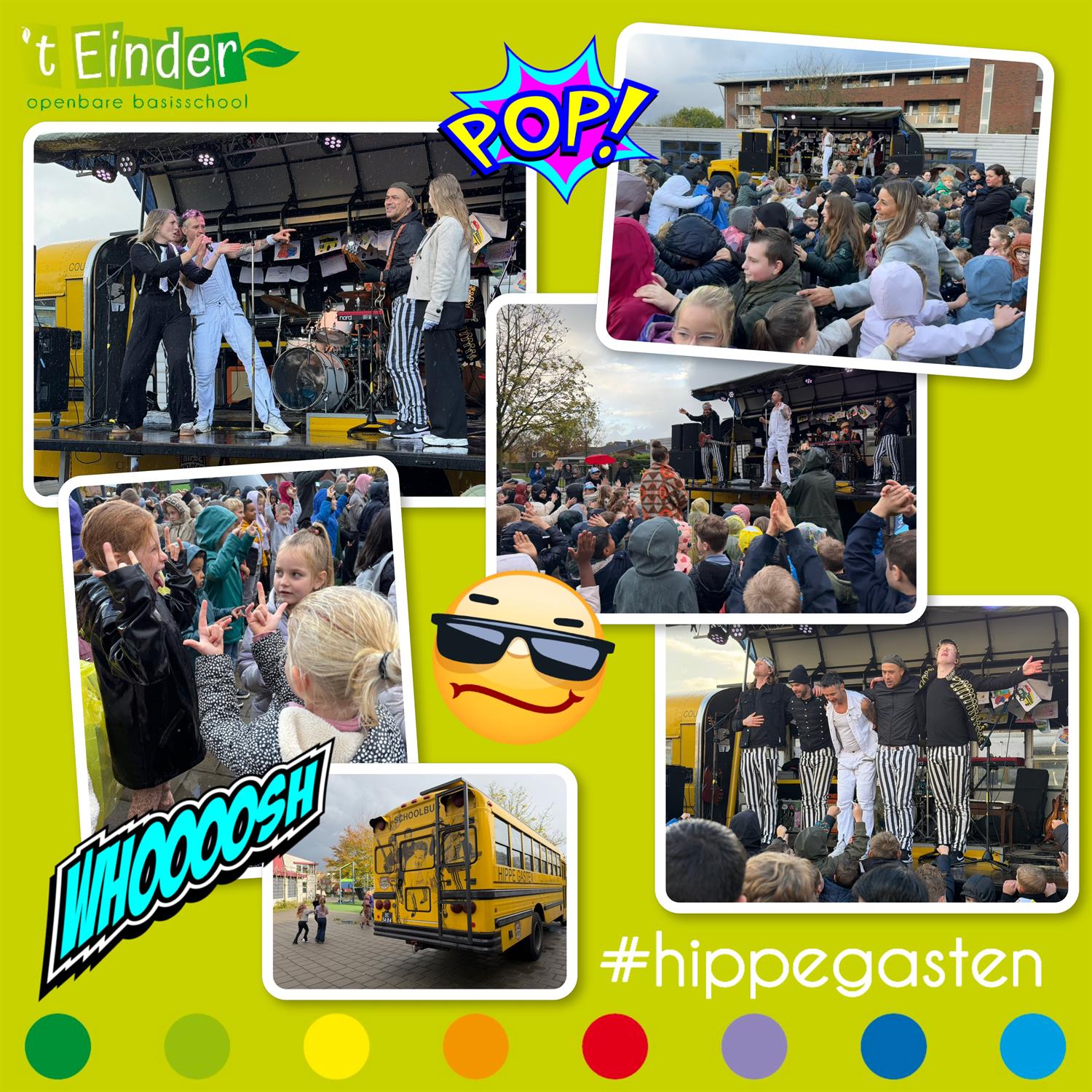 Al vroeg in de ochtend trapten De Hippe Gasten deze feestdag af. Met een schoolbus boordevol muziek reden zij ons schoolplein op. De boxen op vol volume en de gitaren en drums lekker keihard. Het was rocken geblazen!